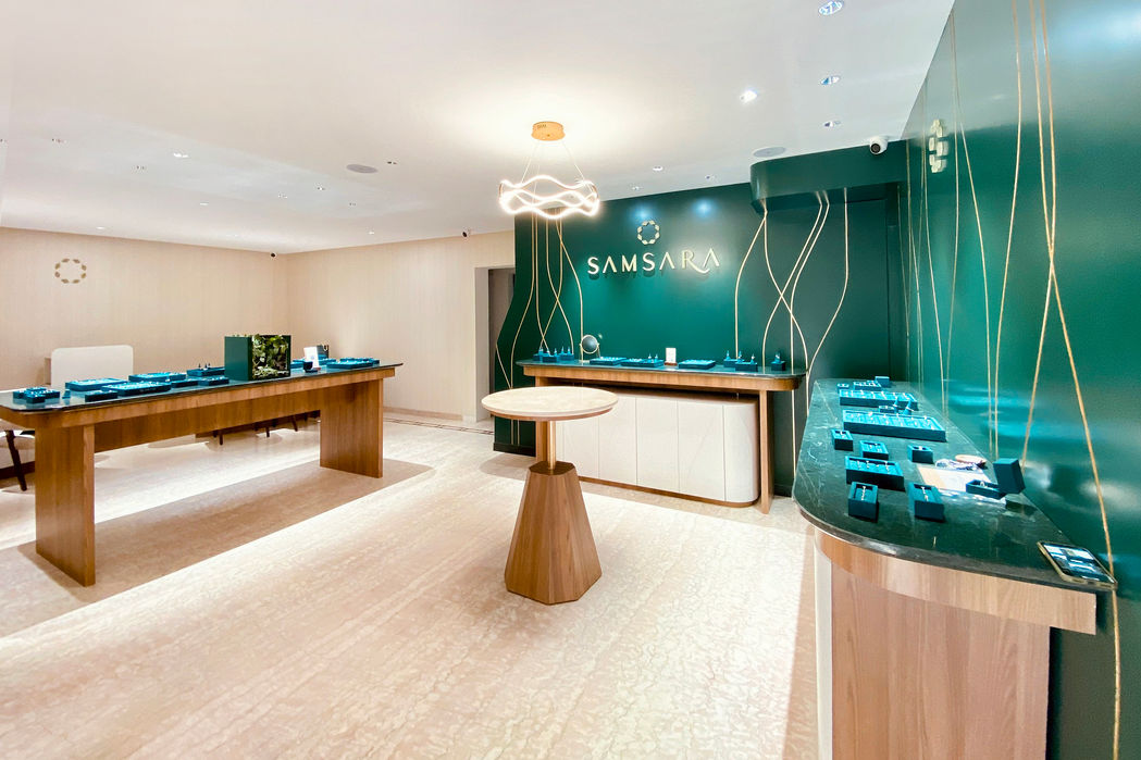 Samsara Diamonds, a brand dedicated exclusively to engagement rings, embodies the joy and excitement of finding "the one" through its thoughtfully designed showroom. The space encourages self-browsing, offering to-be couples a sense of privacy while they explore an extensive collection of rings. Tall counters create an immersive and a non-traditional browsing experience. Soft, sensuous graphic elements symbolize the union of two lives, reinforcing Samsara’s role in this special journey. The design balances richness and sophistication, appealing to modern sensibilities while maintaining an intimate, luxurious atmosphere.